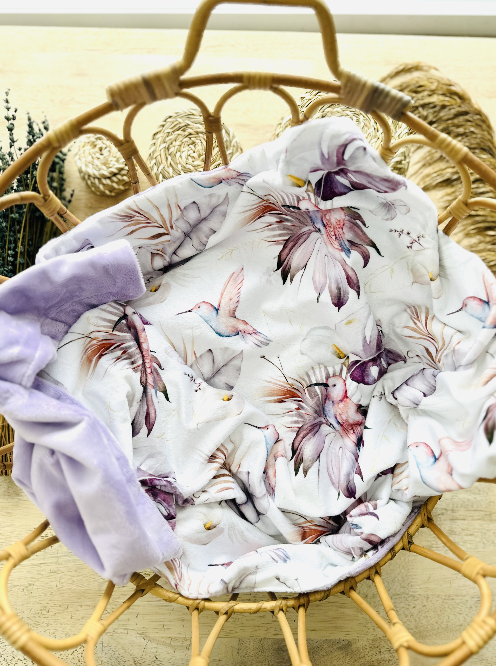 Blanket – Tropical bird back minky lavender