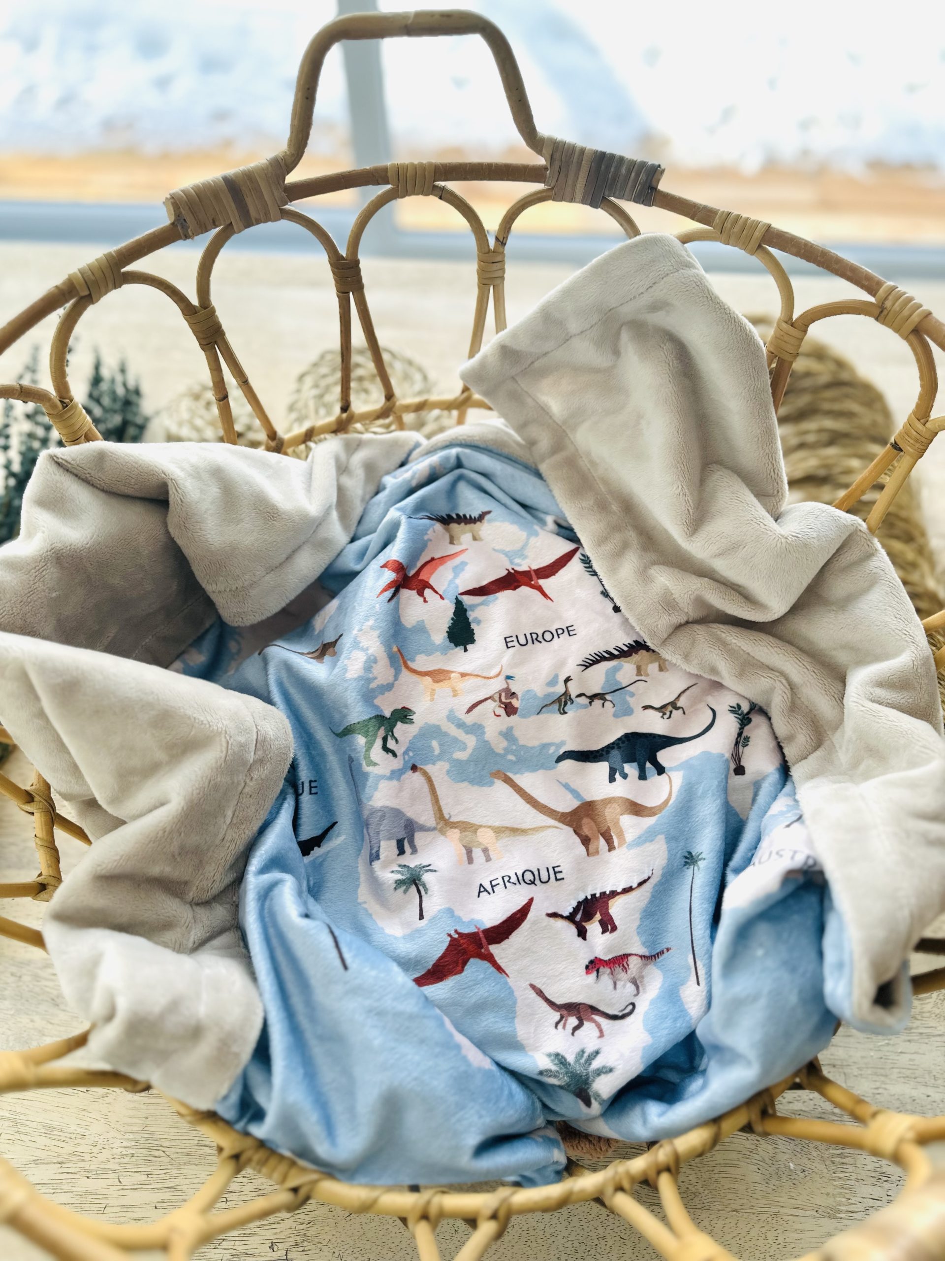 Couverture – Carte du monde des dinosaures fond bleu endos minky latté 24h
