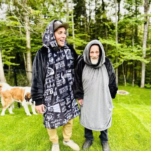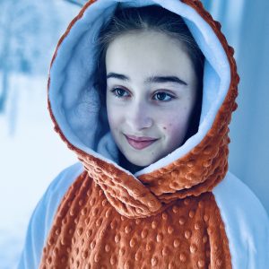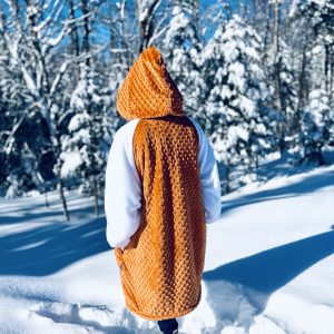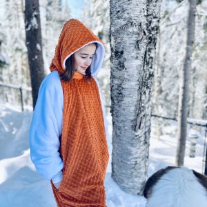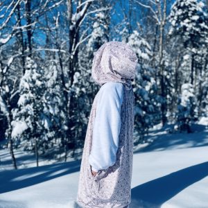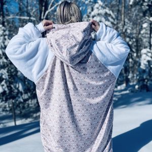 Le Mou-D bicolore comporte le devant, le dos ainsi que le capuchon de la couleur ou du motif que vous aurez choisi et les manches seront blanches ou noires selon la teinte/motif choisi.